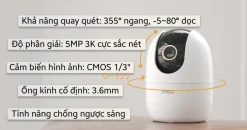 Camera IMOU A52P 5MPIP hồng ngoại không dây trang bị cảm biến CMOS 1/3 inch, độ phân giải 5MP (2688 x 1664 pixels) với ống kính cố định 3.6mm. Sản phẩm camera trong nhà có tầm nhìn hồng ngoại lên tới 10m, góc nhìn 87 độ ngang, 48 độ dọc và 108 độ chéo. Thiết bị Imou A52 hỗ trợ nhiều tính năng như Smart Tracking, Privacy Mode, đàm thoại 2 chiều, phát hiện vật thể,…